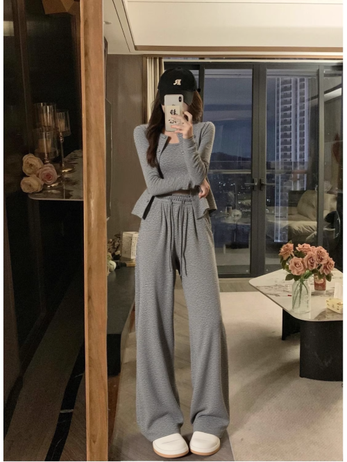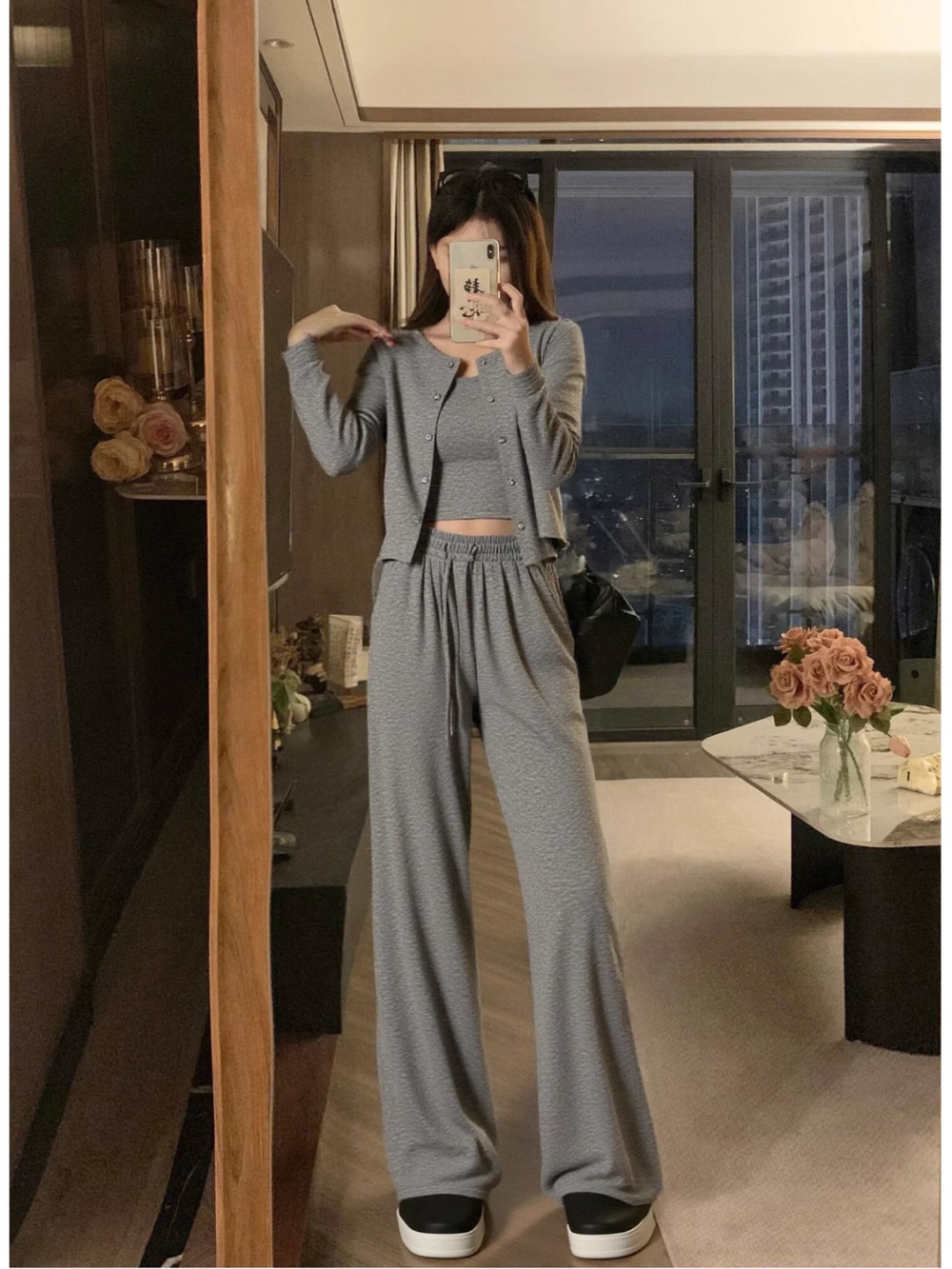 여성 가을 빅사이즈 심플 긴팔 카디건 끈 와이드 팬츠 캐주얼 세트